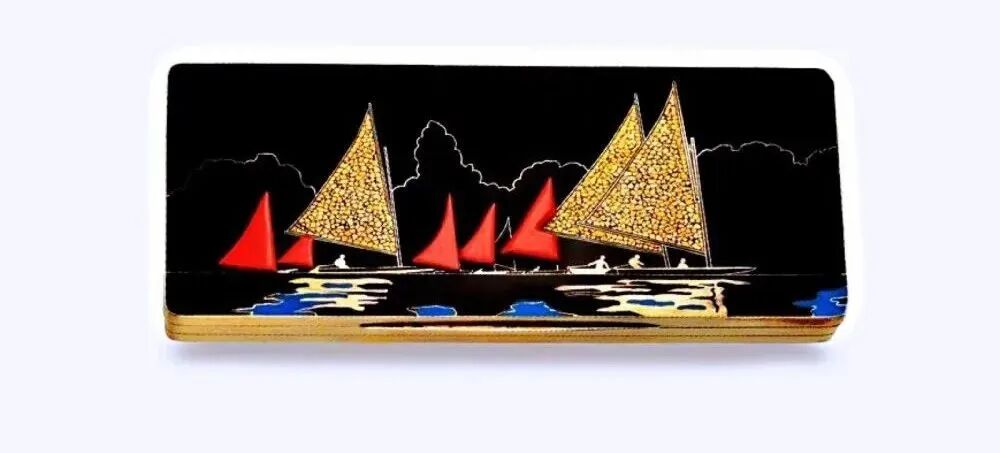 这款古董烟盒,用珐琅绘制了海洋与帆船,蛋壳马赛克堆砌的船帆历经多年,依旧完好,随着时间的推移,发生了迷人的颜色变化。