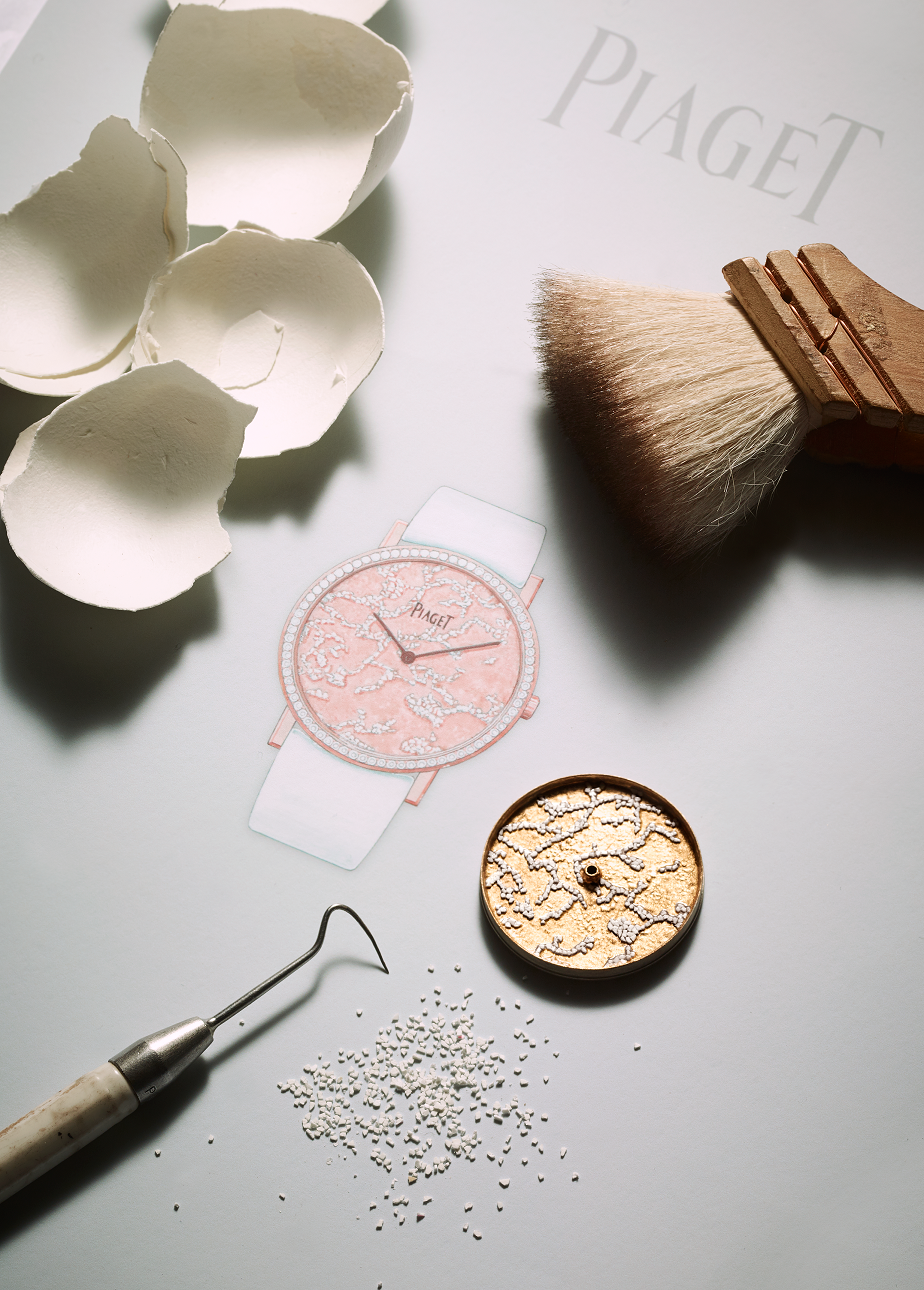 伯爵将脆弱的蛋壳和金箔结合,用廉价和昂贵的素材,进行出特别的质感对比,以难度极高的鎏金手法把蛋壳悉心镶贴于金箔上,将波光粼粼的海面凝聚在表盘上。