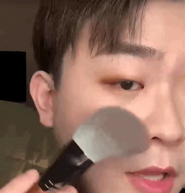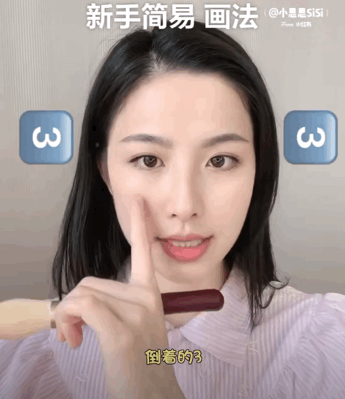 约会腮红:从左边苹果肌到鼻梁再到右边苹果肌,找到一个躺着的“3”,沿着这个波浪形轻扫即可,记得补一下鼻子处的腮红。仿佛是害羞时脸部泛出的红晕,自然又温柔,而且可爱感爆棚~