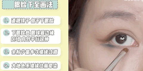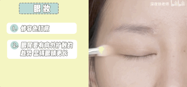 STEP 1:选择一个修容色打底,眼尾要有往外扩的趋势,显得眼睛长;