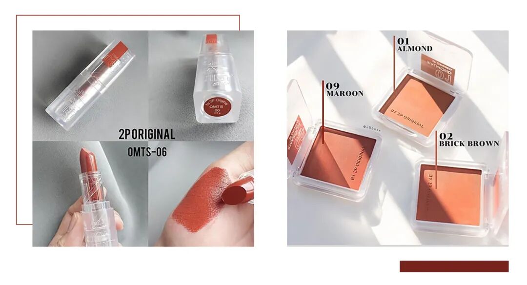 雾面唇釉和腮红棒都是橘粉色和土陶色的外观,两者色号都可以对应上,照着买就不用担心配色的问题啦~