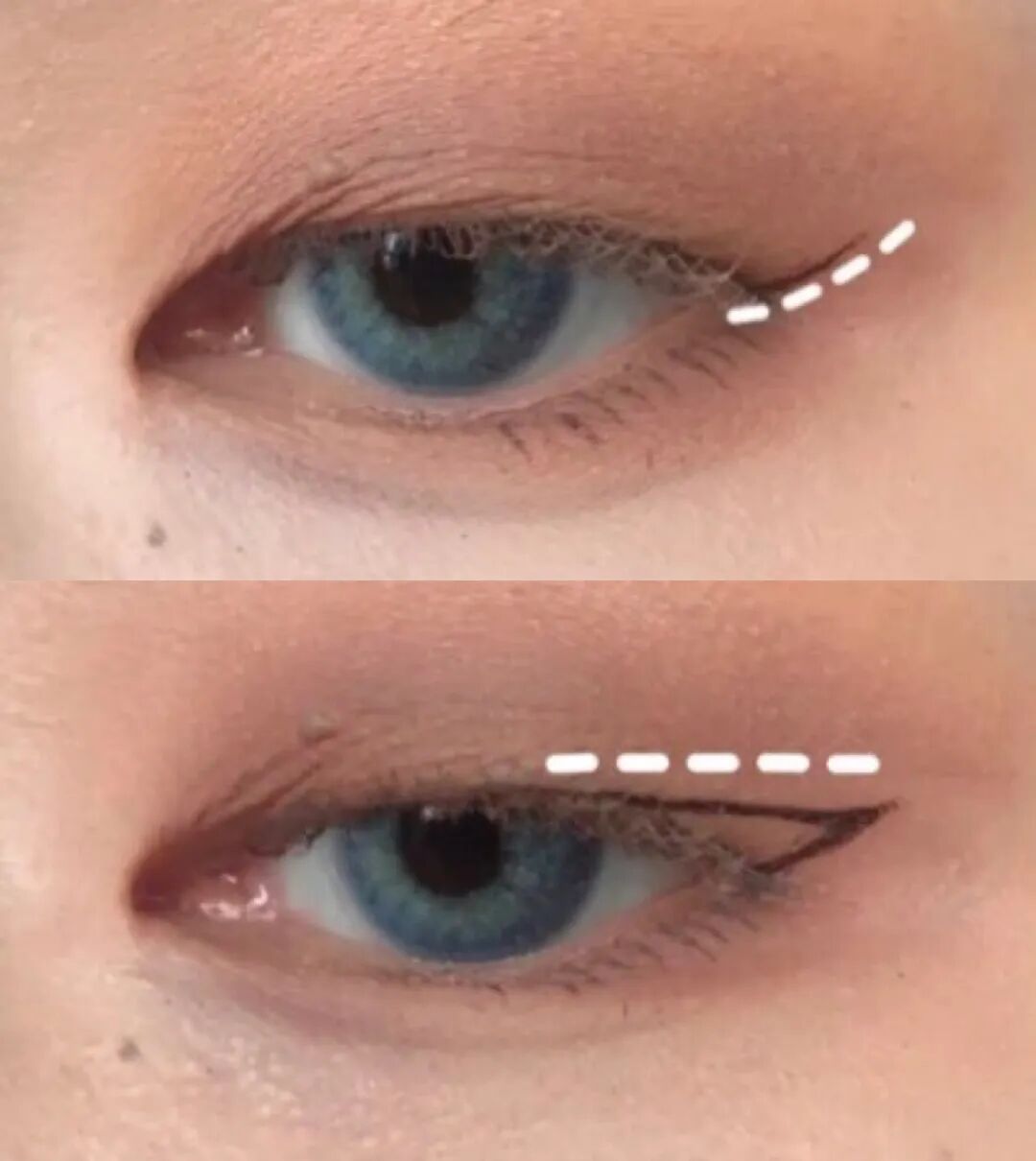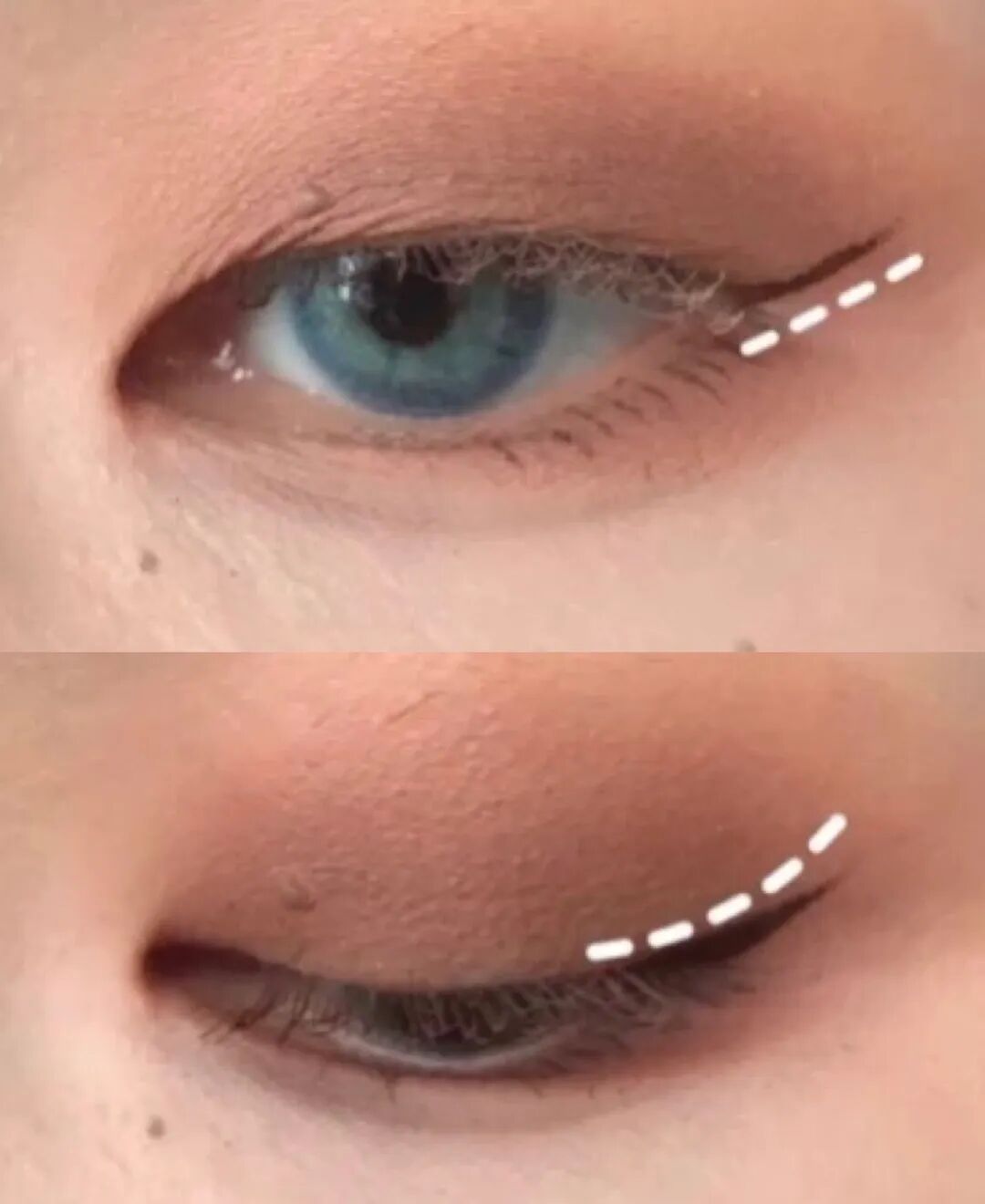 2.直接从眼尾拉出带有下弧度的上扬眼线,再加粗,让眼妆温柔又妩媚。