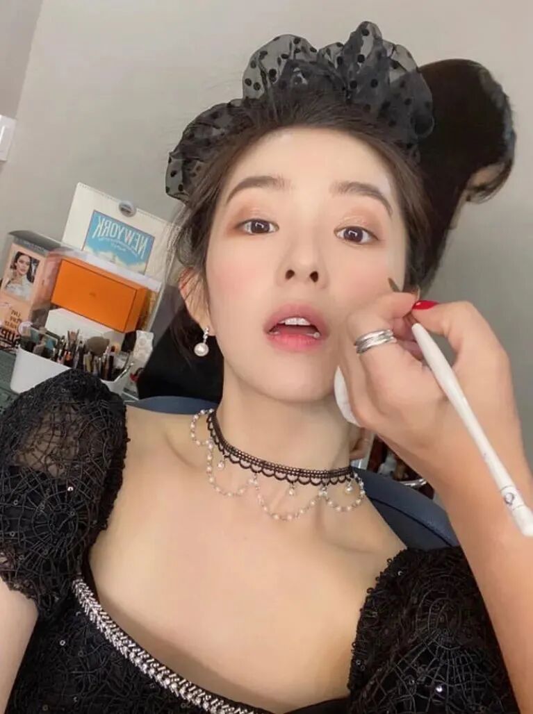 而在需要登台的场合,Irene也会在眼妆部分用到自然款的假睫毛。化妆师会将整副假睫毛分成4~5段,再贴在空缺的位置。