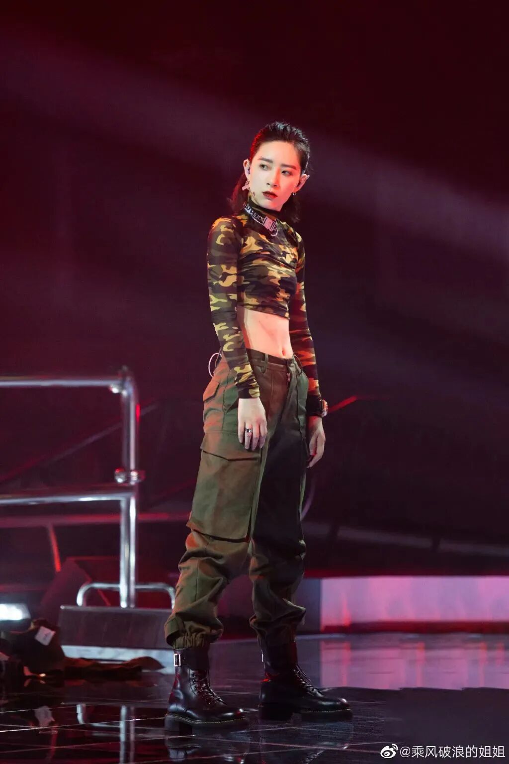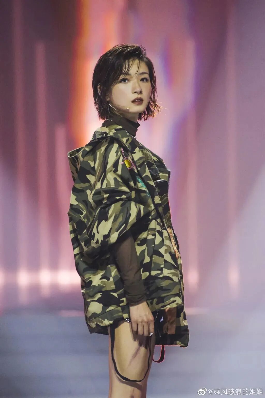 李斯丹妮的All Back发型搭配军绿色长裤和黑靴十分中性,举手投足都直中观众们的少女心。