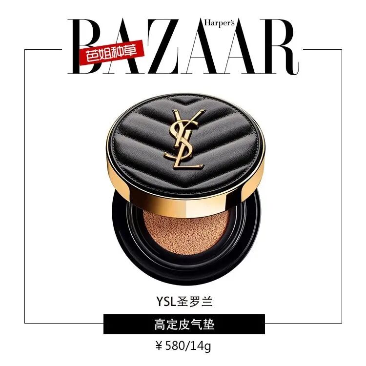 全新YSL皮气垫的质地很轻盈,能打造出哑光雾面妆感,时装灵感的V纹让气垫的包装更显眼,颜值更加分。
