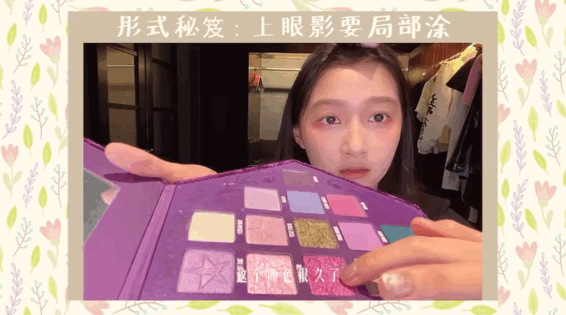 Step7:紫粉色调眼妆。因为是少女感的无辜感眼妆,重点是突出少女的感觉,所以大地色、黑色、红色等就先放一放,还是淡紫色、粉色更适合。用肉粉色打底后,再在眼睛最高点、下眼睑后侧,点涂一些珠光紫粉色。