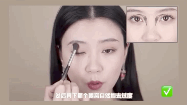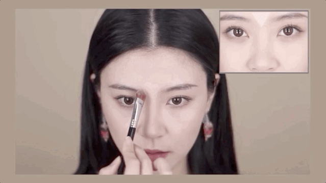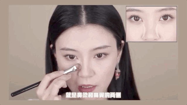 正确的鼻影修容应该是先用刷子少量取粉,在山根和眉头分界处反复多次晕染,再过渡到眼窝,去增强眼周轮廓感。