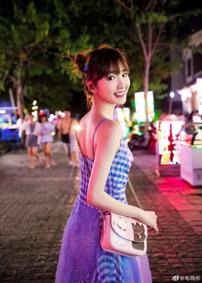 就像毛晓彤这么打扮,双丸子头齐刘海搭配一件蓝色连衣裙,圆圆的眼睛灵气十足,整体看上去活泼可爱有活力。