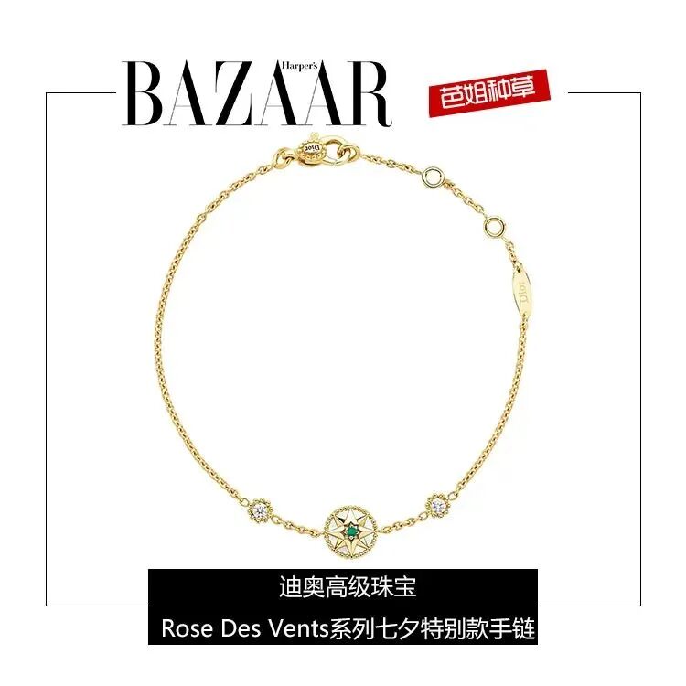 为自己挑选一份礼物,给自己的生活增添一份小情调,不如选择迪奥带来的浪漫——这款特别推出的手链。精致小巧的罗盘玫瑰两侧各点缀一颗钻石,罗盘玫瑰采用珍珠母贝点缀钻石、红宝石或祖母绿,与黄金及玫瑰金辉映,整体设计呈现清新浪漫的质感,日常佩戴也很好搭配服饰。