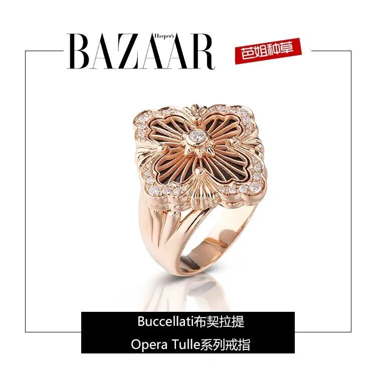 一向对工艺有着较高要求的布契拉提,延续品牌的一贯风格,推出了全新戒指,以彩色珐琅衬底,叠加Tulle“珠罗纱”工艺,在小小的一枚戒指上,呈现出了复杂的结构,工艺灵魂和高超美学展露无遗,黑金的配色加上钻石的点缀,奢华繁美地展现出浪漫意式风情。