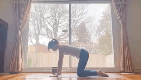 穿针式要先跪立在垫子上,右臂从胸下穿过,放到左侧腋下,左臂向前侧伸直,右肩和右耳贴在瑜伽垫上,身体放松,感受背部的拉伸,保持5个呼吸;