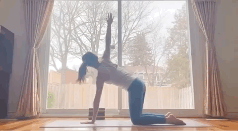 再换到另一侧,双腿保持不变,身体向右扭转做相同的动作,还可以试试将右手臂向上举起伸直,眼睛看向左手指尖,保持5个呼吸。