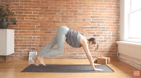 下犬式就更简单了,双手双脚放在瑜伽垫上,伸直背部,用力下压,胸腔靠近大腿,臀部抬高,延长脊柱,1分钟为一组,每天做5组即可~