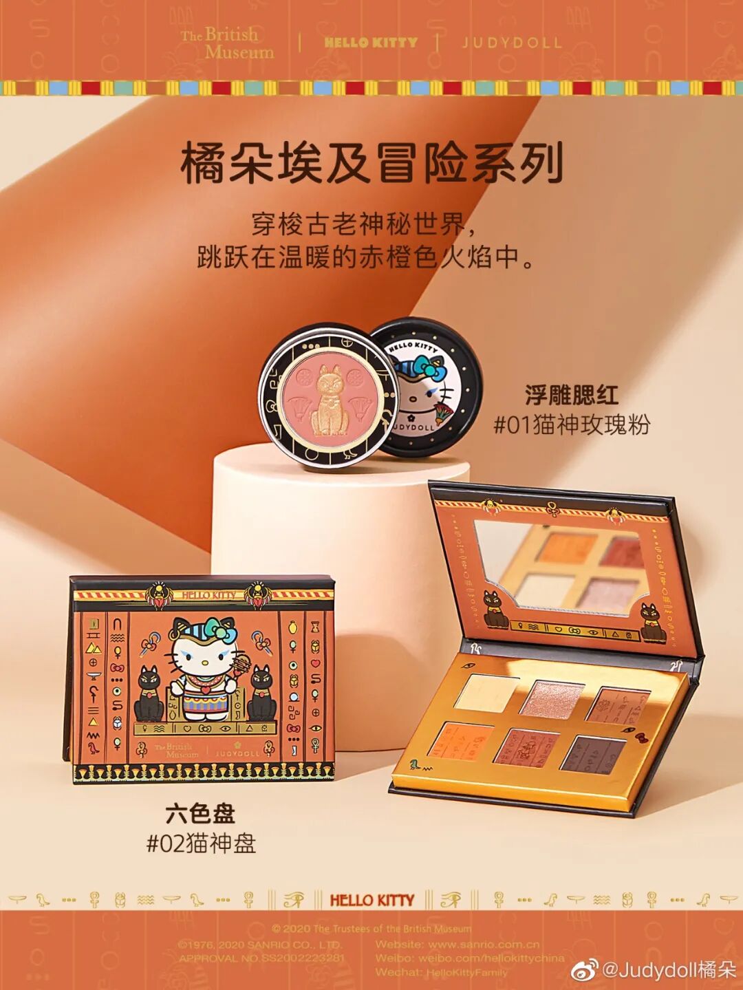 卡通猫猫界的重量级人物当属Hello Kitty!橘朵与大英博物馆、Hello Kitty联名出了埃及冒险系列。这个系列包含高光、腮红和眼影盘,整体是很有古埃及神秘色彩的暖黄色调,好看又好用。还都印有猫咪元素的印花,加上橘朵一贯的优秀粉质和显色度,爱猫姐妹冲啊!