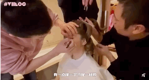 首先在头发上,因为她的后侧比较高,单纯用自己头发来做的话是达不到效果的,所以妆发老师选择用她本来的头发结合假发。先把她自己的头发盘在后侧然后再将假发整个覆盖上去。