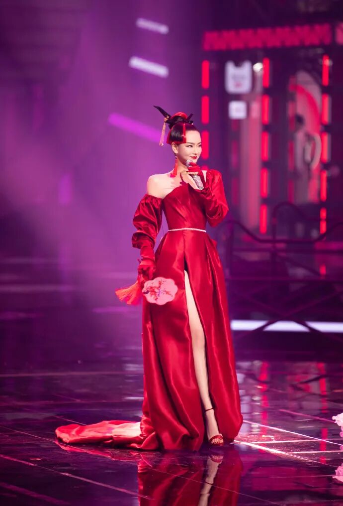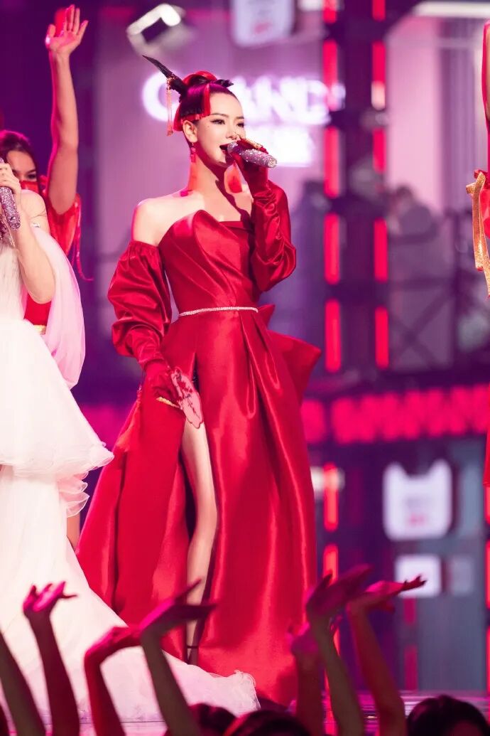 双十一开播盛典的时候戚薇也选择了黑红配色的造型,不同的是双十一的整体造型是红色系,黑色作为了点缀。