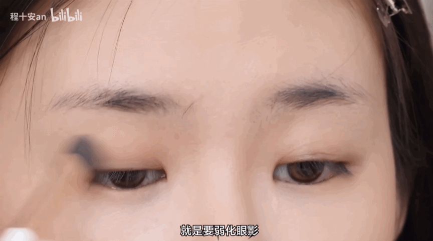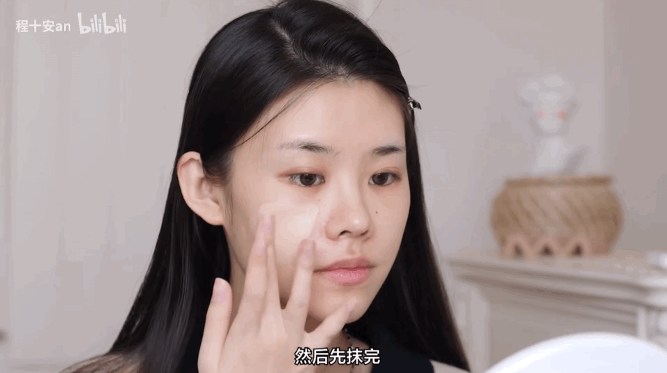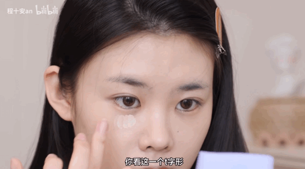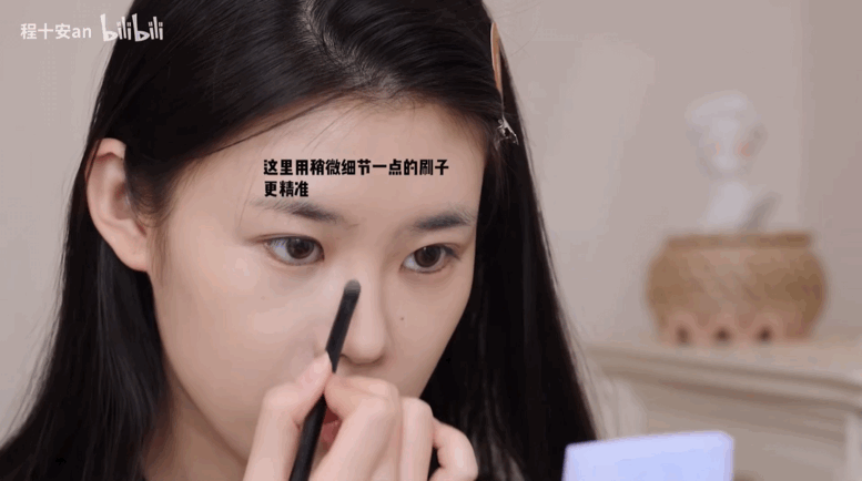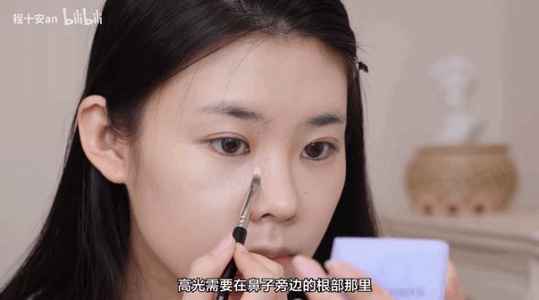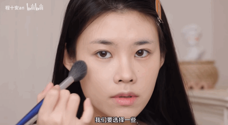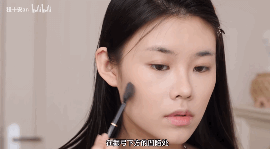 如果有颧弓外扩的姐妹,还需要做一个精准的提亮,即在颧弓下方凹陷处向鼻尖的方向扫哑光的高光。