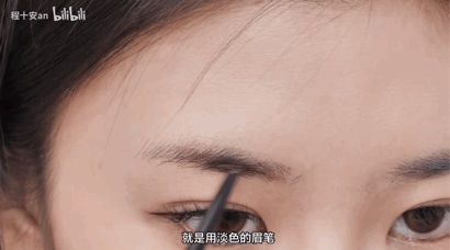 眉毛部分用淡色的眉笔轻轻画出眉形,再用黑色的眼线笔直接填补,增添浓黑的毛流感。