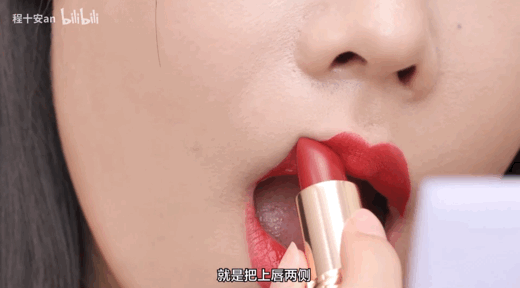 选择一支与自己的红色衣服和谐搭配的红色口红,在画的时候把上唇两侧扩出去一点点,更显气色。