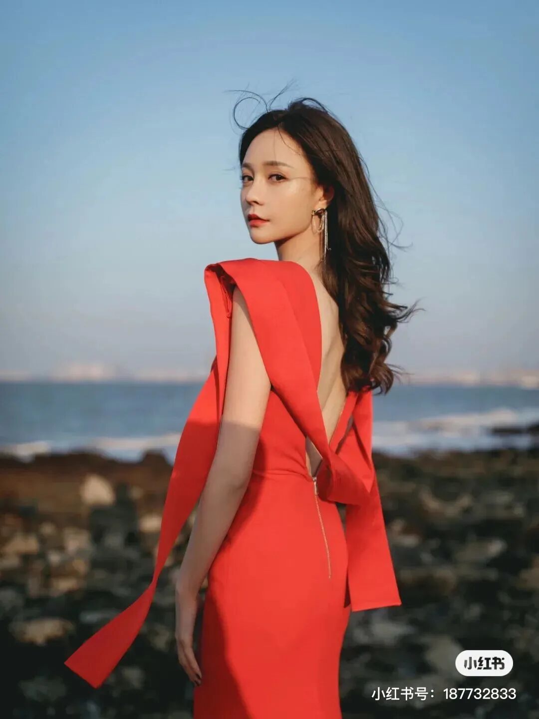 沈梦辰的红色礼服配大卷发,一阵风吹过,女人味与优雅感并发!