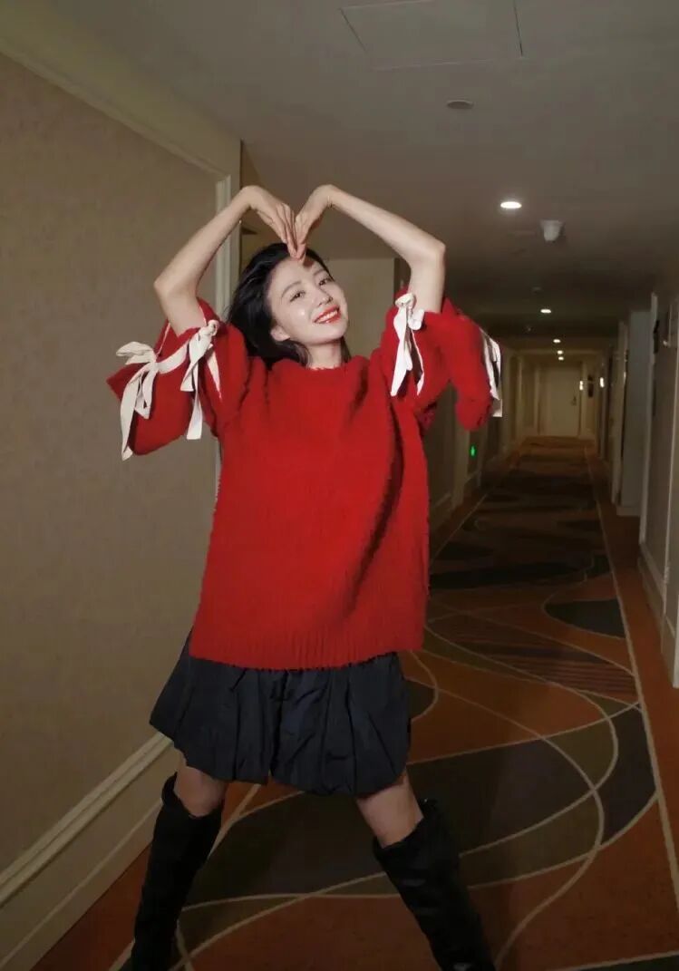 王楚然的红色毛衣加上白色蝴蝶结,灵动可爱,少女感满满!