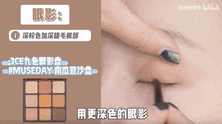 换一把小一点的刷子,蘸取哑光深色加深睫毛根部到眼尾,塑造出原本的眼部轮廓。