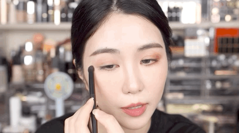 用细节刷蘸取打底哑光色,从下眼尾后半段开始平拉出去,再用橘色眼影勾勒加深,画出眼睑下至的效果。