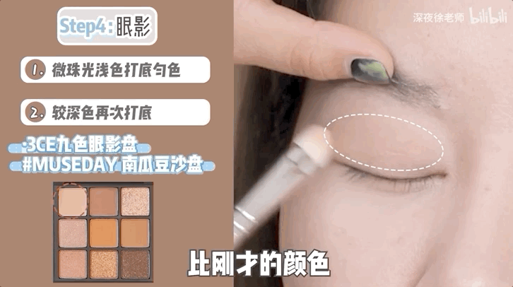首先,选取微珠光色为眼妆打底接着蘸取较深于肤色的哑光色再次打底,增加眼妆底色的层次感。