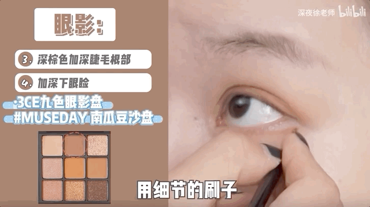 换一把圆头细节刷,继续蘸取深棕色加深睫毛根部,并在此加深刚刚画出的眼睑下至边缘。