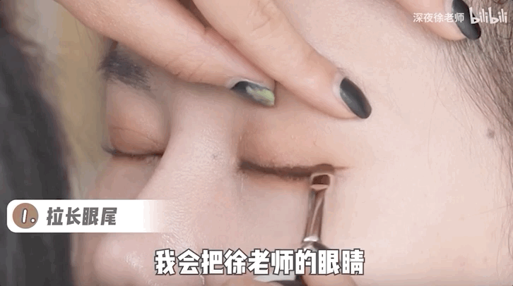 细看不管是虞书欣、徐老师还是之前同类型妆容比较出圈的宋祖儿都是偏圆的眼形,而开放式的眼睑下至化法刚好能弥补圆眼睛后段的不足,拉长眼尾。