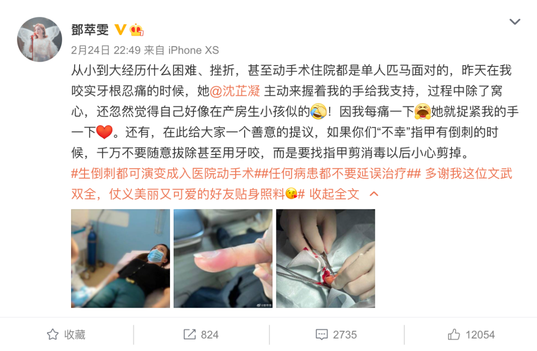 邓萃雯在文中提醒大家如果甲周有倒刺,千万不要随意拔除甚至用牙咬,而是要找指甲剪消毒以后小心剪掉,如果肿胀持续不消一定要及时就医。