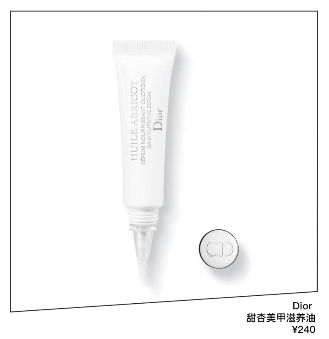芭姐推荐:DIOR这款甜杏美甲滋养油,糅合特别配方与活性油成分,能够提高甲面韧性,解决指甲软、薄的问题,同时补充角质层水分,每日早晚一滴涂抹于每根手指和甲面,轻柔按摩使其渗透,轻薄毫无油腻感。