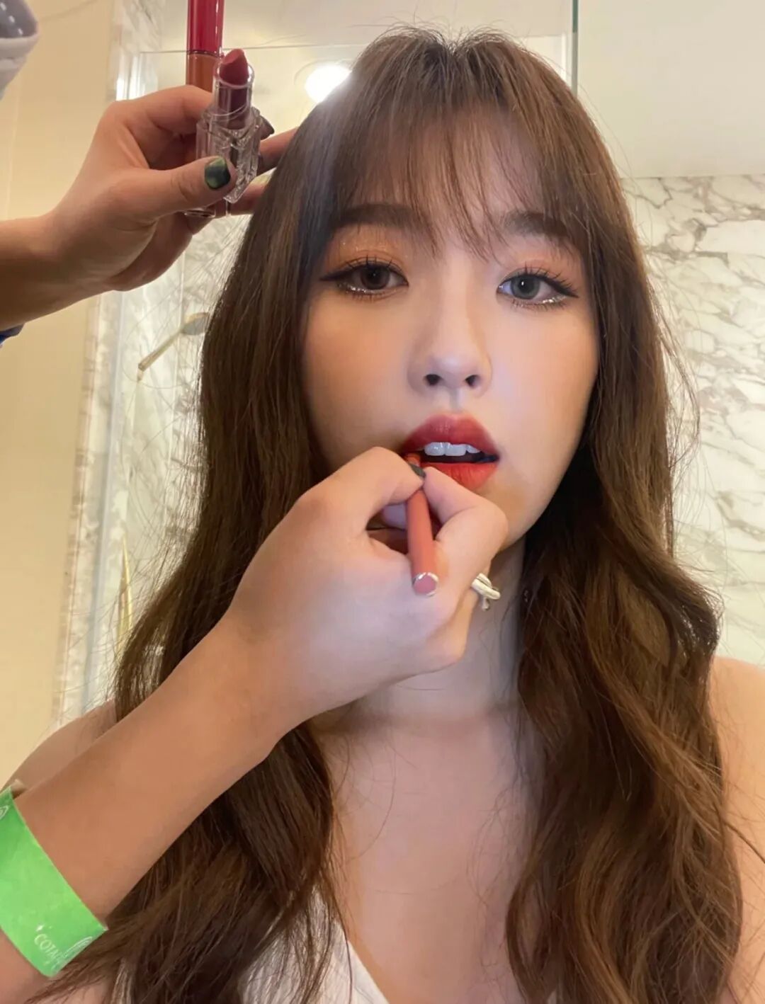 杨子珊化妆师传授的方法简单好用:等到口红干掉后涂上口红雨衣,再涂上一层无色的润唇膏,不用担心破坏掉原来画好的唇色哦~