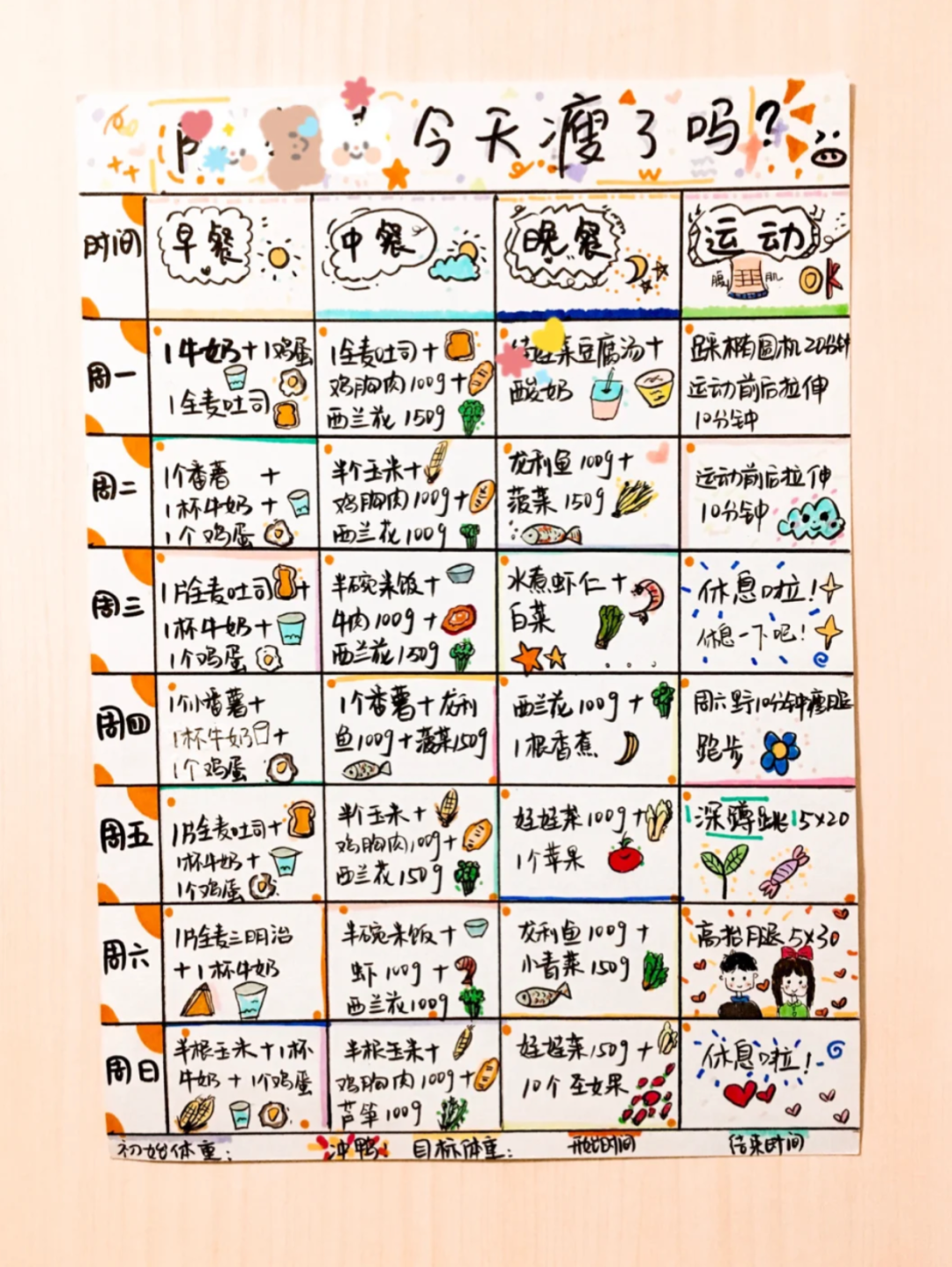 注意成果是要去观察体脂和三围的变化,而不是紧盯着体重秤上的数字哦!另外,当参考标准已经3周都没有变化时,先别急着沮丧,平台期的出现是在提醒你该换计划啦~热量缺口是饮食+运动一起制造的,所以别想着靠节食不动这种懒人法减肥啦,注定无法长久。