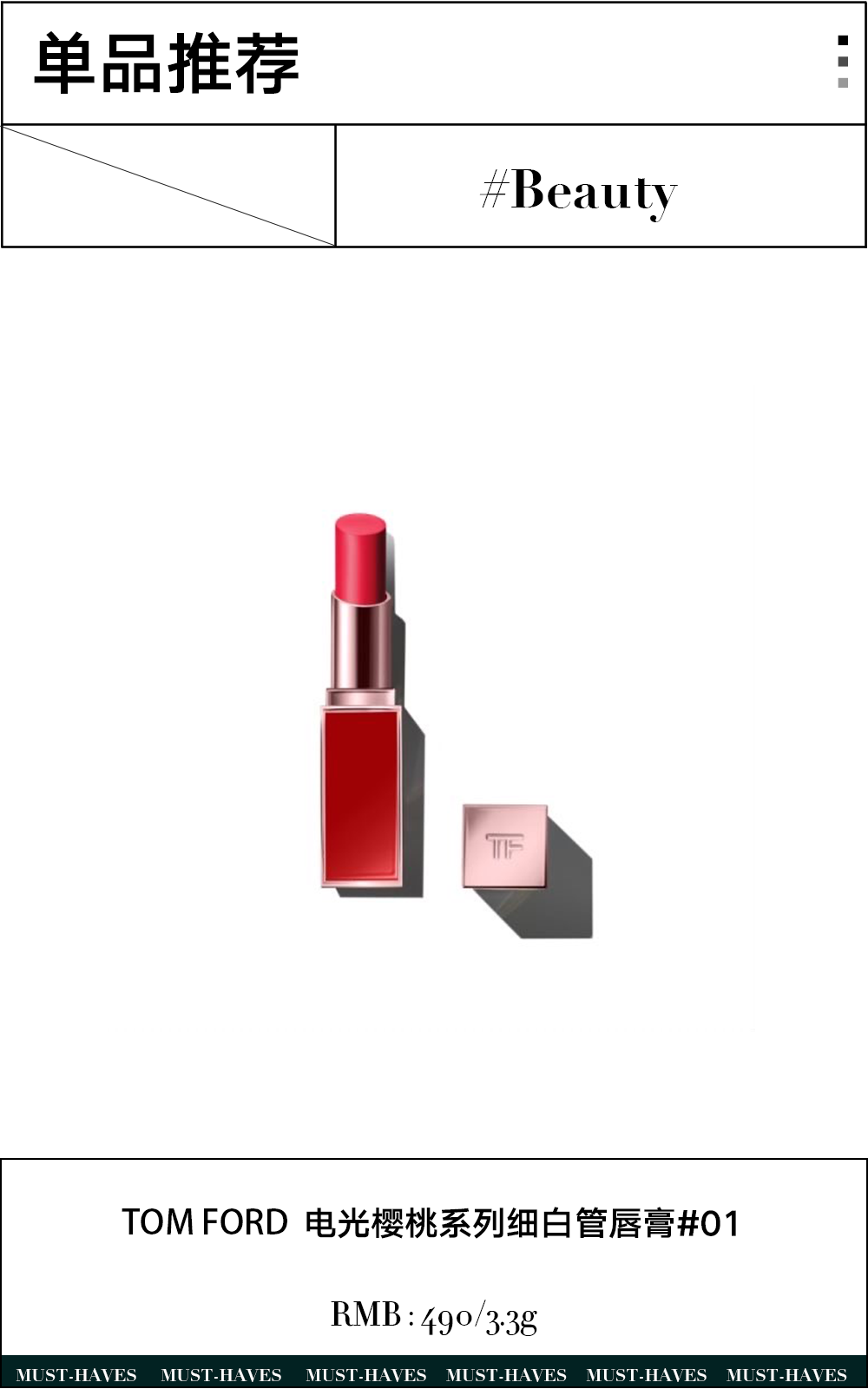 我们推荐:如果你想拥有一支即撑得住高强气场,又能透露出娇媚可人的口红,那TOM FORD这支樱桃洋红色的限定细白管唇膏#01是必入的选择,薄涂是玲珑轻盈的气色双唇,厚涂更是饱满晶莹,溢出满屏迷人诱惑。