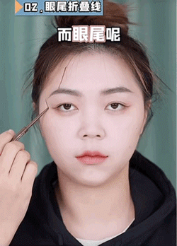 额头折叠线位置在眉峰上方,用修容色从发际线开始往前轻扫即可,外眼角处从眉尾开始连接到眼尾外,也是同样的手法,从发际线里面扫到太阳穴。