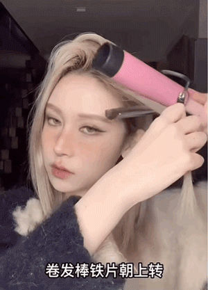拿一个卷发棒,取耳朵周围那一区的头发,铁片夹住后朝上转动做一个外翻,稍微松开一点后,将卷发棒头朝下继续往外转,然后停留5秒左右松开。