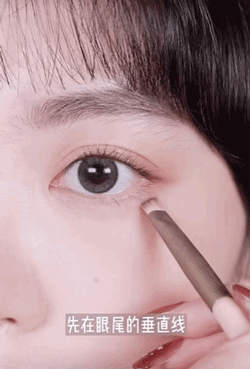在眼球下方和下眼睑边缘确定好下至的两端,用刀锋刷蘸深色眼影连接起来然后晕染,余粉勾勒出卧蚕,再用自然米白眼影去提亮眼尾下睫毛处和卧蚕。