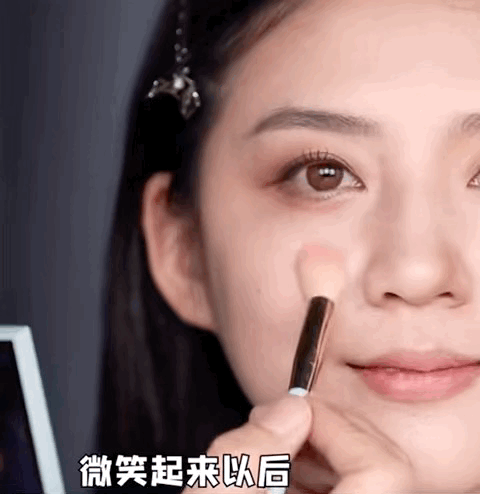 再用腮红来圆润苹果肌和修饰颧骨,轻轻扫在苹果肌的最高点,并以画圈圈的方式进行小范围的晕染,面中瞬间自然饱满,向内收拢~