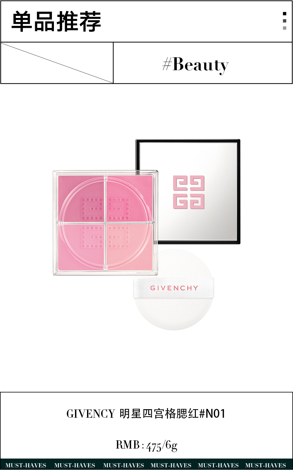 打破色彩束缚的GIVENCY 明星四宫格腮红是独特的散粉腮红,超微空气感的粉质轻盈细腻,多次叠加也不沉积,感光显色配方让色彩随光线应变,自然又灵动,也有四款色号任你选择哦!