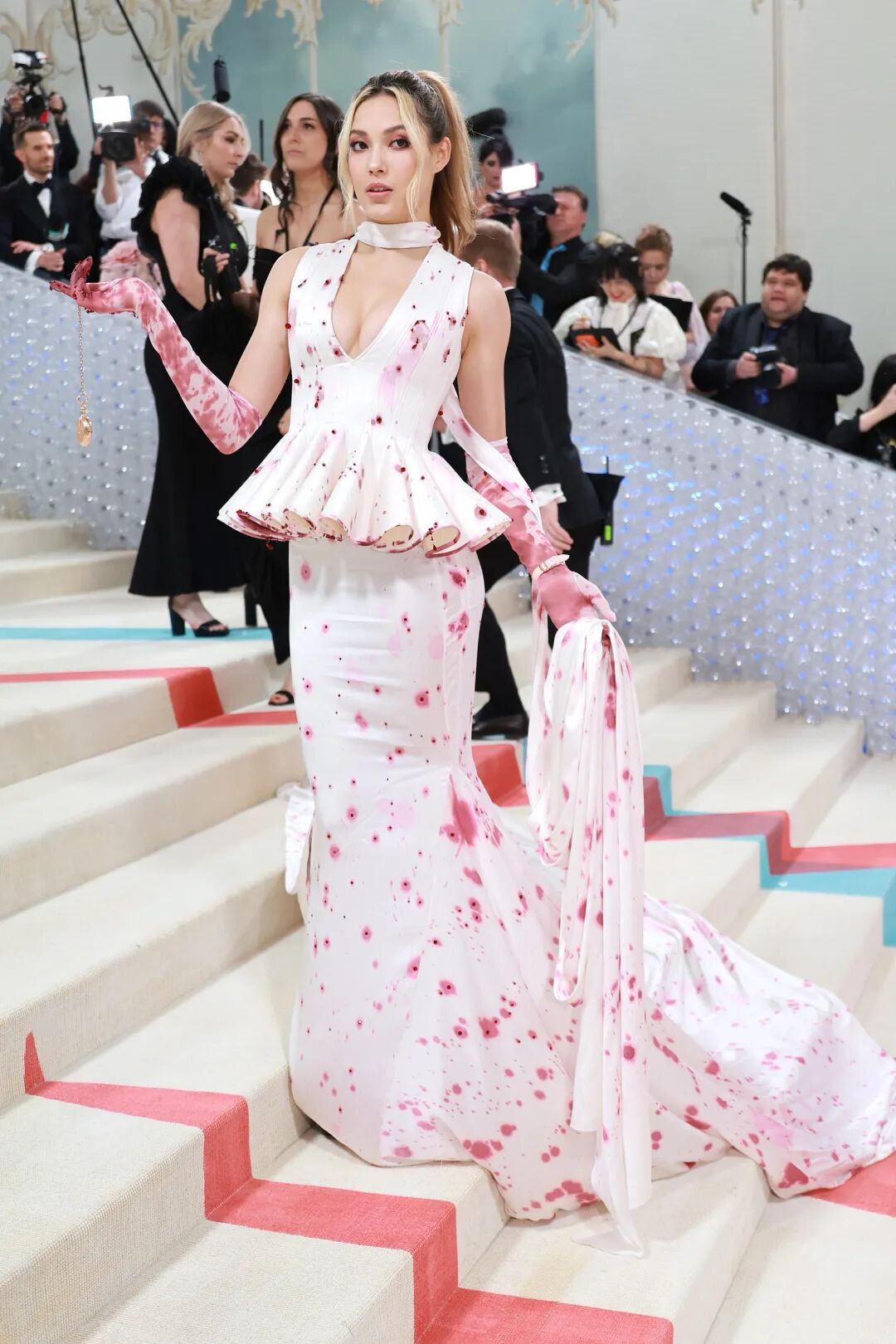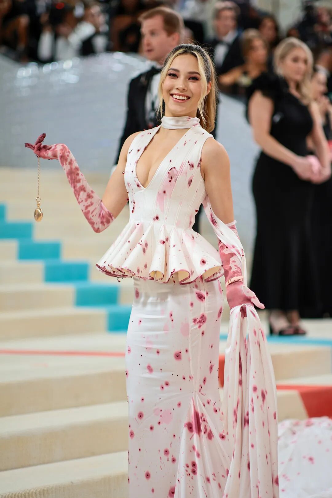 还有“我们的朋友”谷爱凌,身穿Robert Wun的最新季高定,酒渍礼服的造型让她更显俏皮,红毯上将怀表代替了红酒杯,把礼服设计灵感发挥到了极致。