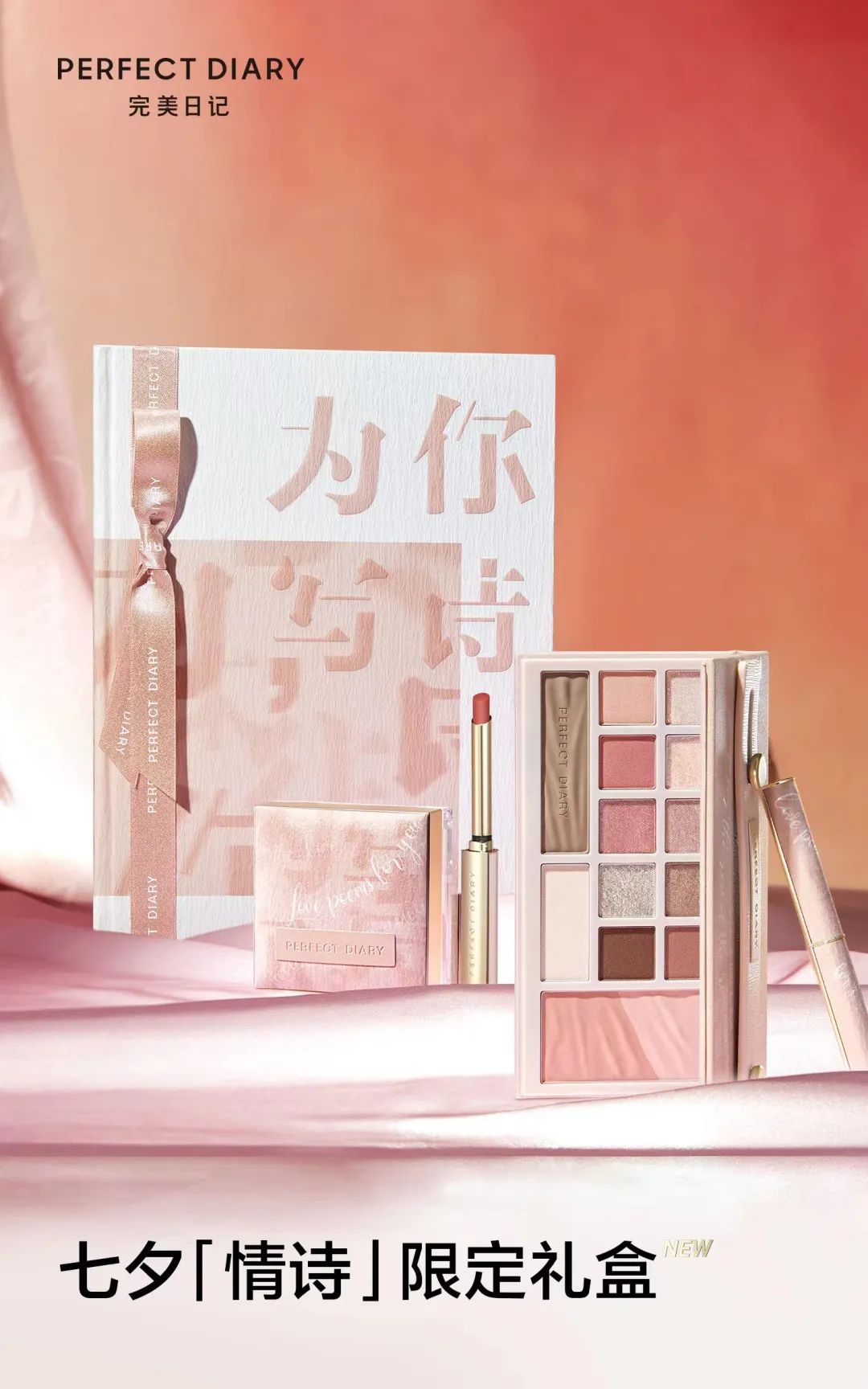 细黑管唇膏#01瑰中密语是那朵裸色绽放的玫瑰,#02瑰中浓情则是显白不挑皮的酒渍玫瑰豆沙,魅惑十足。眼妆的雕琢也是重要功课,四色眼影#01一夜玫瑰盘,神秘粉紫颜色讨巧,全哑光配色上眼消肿又显色,#30孤傲玫瑰盘,复古配色搭配粉色爆闪,温柔矜贵的大小姐这不就有了!还有“全能奢金气垫”,高倍防晒,精华护肤,清透底妆三手抓,有它一个就够啦~要说中式浪漫还得是PERFECT DIARY 七夕限定情诗礼盒!肌理感云宣纸包装上手就是浓浓诗卷质感,感情诗文字设计细节十足,附有爱情诗层和示爱贺卡将甜甜爱意浓缩于方寸纸上,也可电子留言和存照,把说不出口的情意用心传递~四款七夕限定一次收入礼盒囊中,「云纱邂逅」粉杏色系眼影综合盘妆效甜美不出错,抗氧小蓝锁技术保持12小时妆效在线,还可满足阴影、高光、腮红多种妆容需求,镜面贴心上妆公式让你享受玩转浪漫氛围妆容的乐趣。想体验丝绒雾感质地?小细根情诗口红限定非它莫属,#L31奶桃香云纱粉橘色调软软糯糯,温柔可人,#L32甜茶慕云纱绯红暖调不挑皮,清冷微醺气质拿捏得死死的。