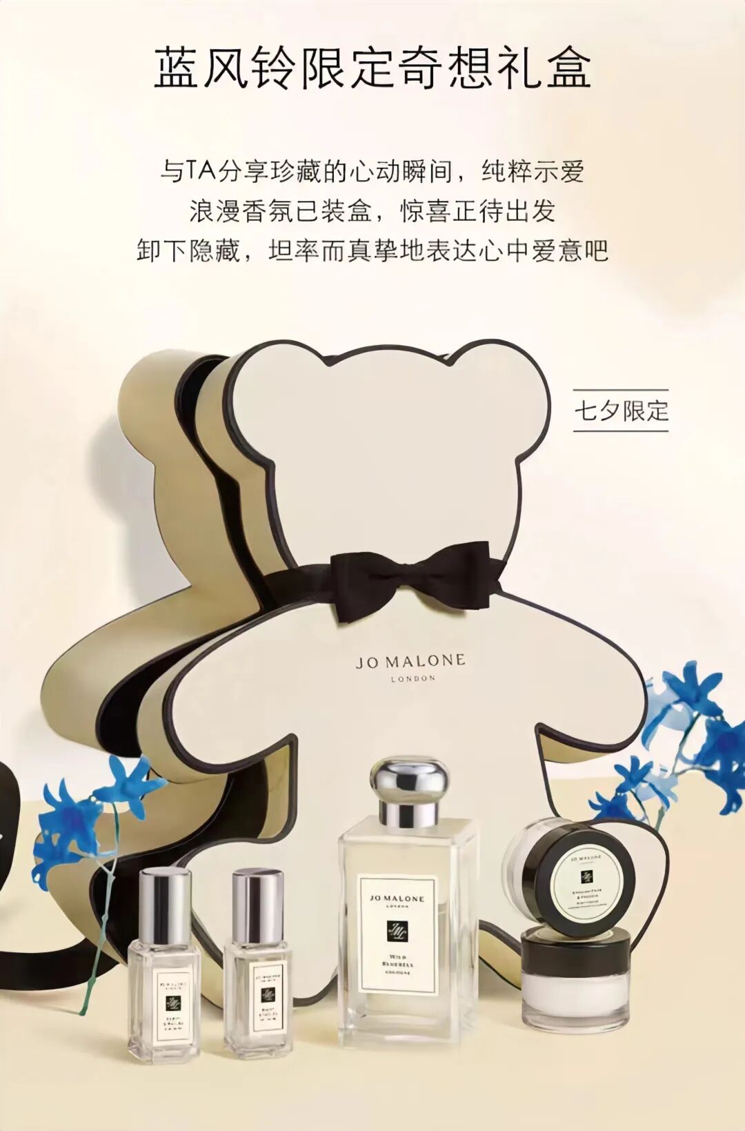 JO MALONE 的奇想礼盒是属于两个人的奇思妙想!小熊外形的「蓝风铃限定奇想礼盒」包装可可爱爱,经典“蓝风铃香水”好闻不腻,前调蓝风铃清雅,中调柿子甜香四溢,白麝香的尾调更带丝丝干净柔软的气息,还有香氛小样和迷你润肤霜赠送哦~猫咪造型的「经典混搭限定奇想礼盒」很吸睛,除“蓝风铃香水”外,限定版“英国梨与小苍兰香水”的馥郁果香调闻着也很舒心,甜润的果香和清新小苍兰的神奇相遇,再来点广藿香收尾,香味余韵悠长。看了这么多浪漫七夕限定,有没有被种草呢?喜欢哪一款的话快快下单,收获今年情人节的专属快乐吧。