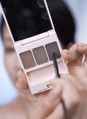 STEP 1:选择深棕色三色眉粉和扁细头眉刷,确定三点眉形,在瞳孔外缘、眉毛靠上处确定最高点,眉头眉尾处保持同一高度作为剩下两点,连接三点画一条流畅平缓的弧线。