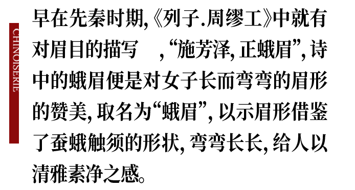 在文人骚客笔下,有关女子眉妆是诗句也俯拾皆是,“小山重叠金明灭,鬓云欲度香腮雪,懒起画蛾眉,弄妆梳洗迟。”可见画眉早已成了古时女子梳妆打扮不可或缺的一部分。