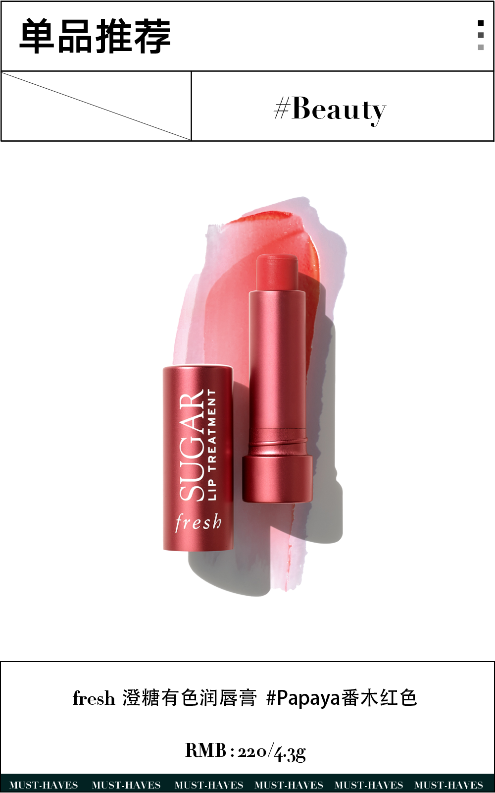 唇妆要想好看,唇部状态也得保养,fresh 新款经典滋润护唇膏主打蔗糖、蔓越莓籽油成分,维持唇部水润平滑好状态,还有若隐若现的蔗糖柠檬混合香,日常唇妆选#Papaya番木红色,颜色明艳有活力,提气不挑皮~