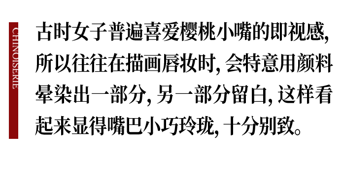 红唇齿白,樱桃小嘴便生动体现出女子们对于唇妆的情有独钟的审美情结。