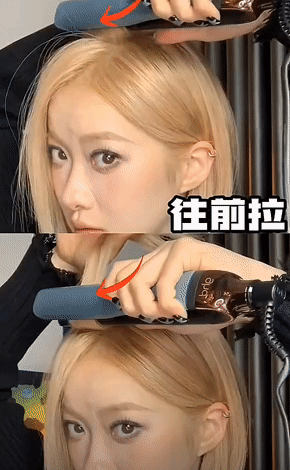 然后打造蓬松的颅顶,用直板夹夹住发根上部,整体把头发往前拉。PS:常分发缝处的头发记得往相反的方向拉,这样前后左右的头发看起来都超饱满。五官比较硬朗、线条明显的脸形,本身不太适合直直的朵拉头,但只需要加点发型巧思,在一定程度上可以缓解脸形适配问题。微微增加些弧度和卷度,既能柔和五官线条带来的硬朗感,还能多些轻盈的透气氛围,造型显得不沉闷。