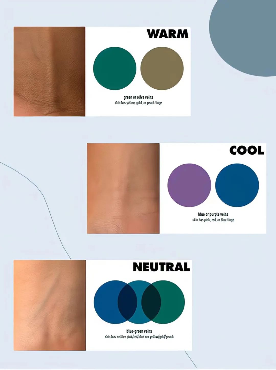 暖肤色,日常穿搭和发色里带一些暖调色彩会更出彩,而中性肤色是百搭不挑的肤色,冷色调则自带清冷感,可以试试饱和度低一些的颜色~