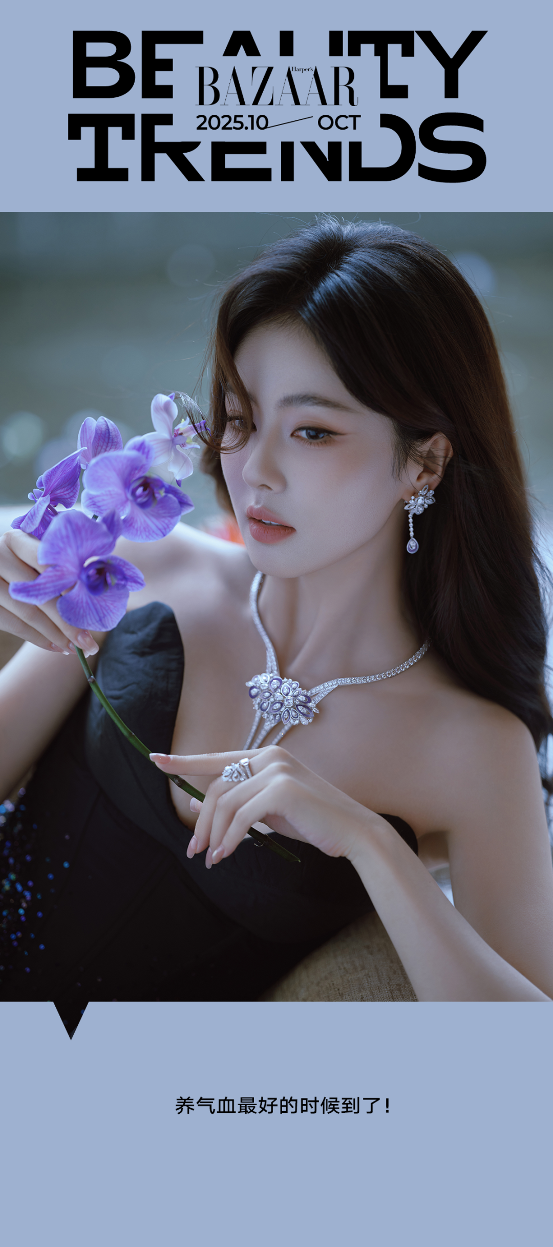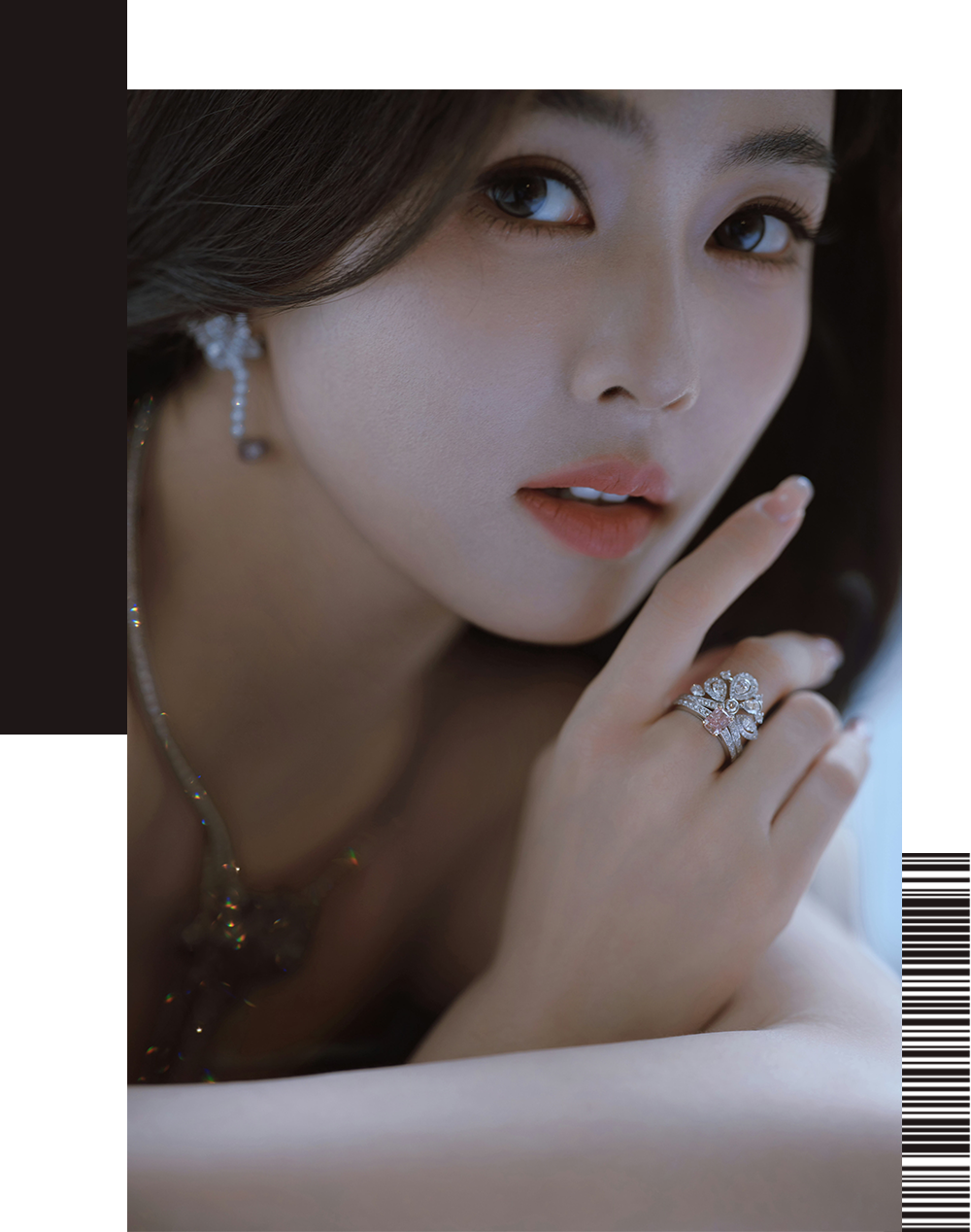 钻石与美人的搭配,果然更显熠熠光华,举手投足间神态舒展,姿态轻盈自若,肌肤也透着细腻光泽,眼神清澈明亮,整个人散发着由内而外的健康与生机。
